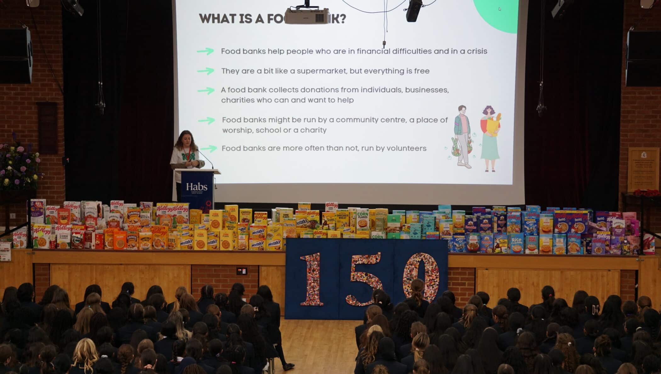 Habs Girls celebrated our Harvest Festival by welcoming Nina from Food Bank Aid to speak at both Junior and Senior School assemblies. Nina spoke about food banks, explaining what they are and how Food Bank Aid supports 33 food banks in the North London area. She also spoke about some of the factors that contribute to people needing to use food banks and what the charity needs to support those who need help most. As a whole school, we took part in Food Bank Aid’s Breakfast Champions initiative by collecting boxes of cereal and today we were able to present our offering. Thank you to everyone who took part by bringing something in.